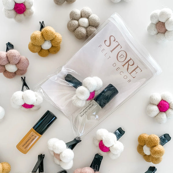 Simply slide the felt freshener on to the vent clip, pop onto a vent in your car, drop some of the essential oil onto the felt flower and enjoy the fragrant fun.