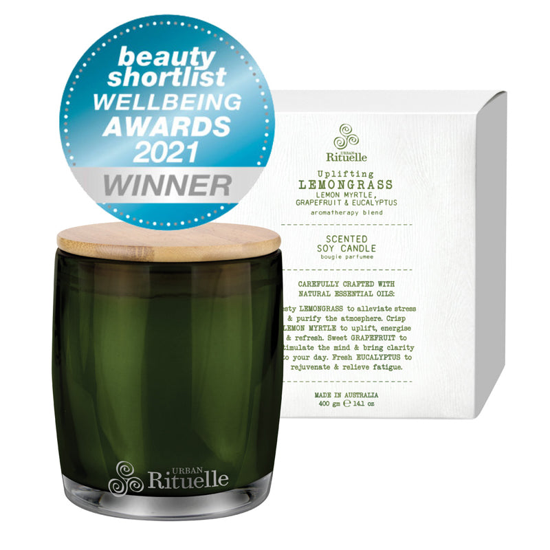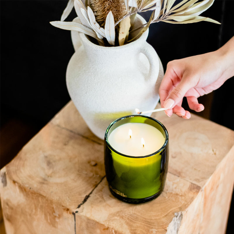 This green glass candle features an uplifting blend of lemongrass, lemon myrtle, grapefruit and eucalyptus essential oils.