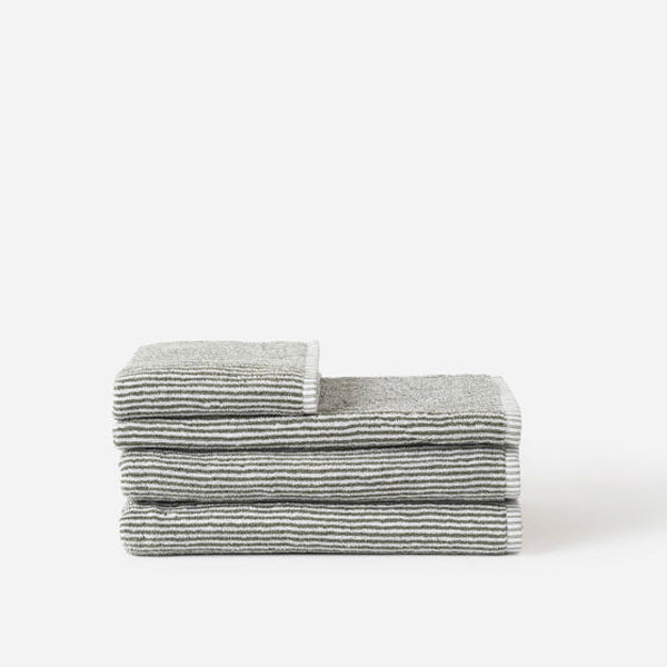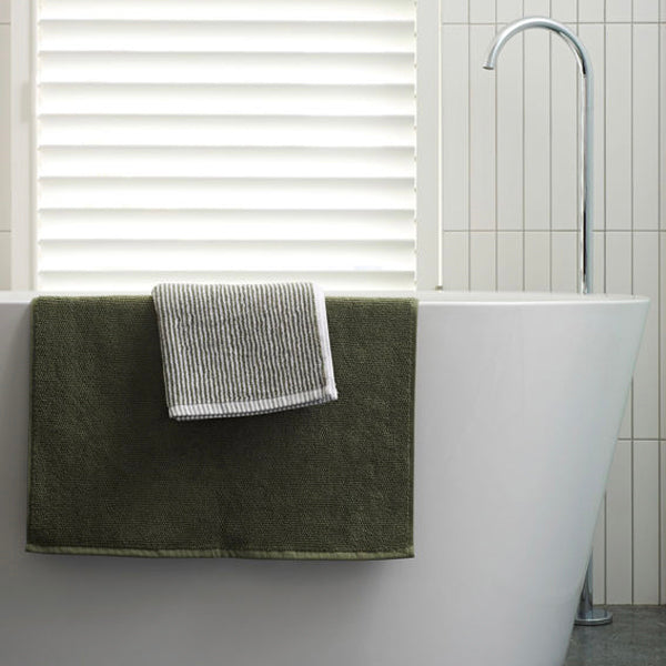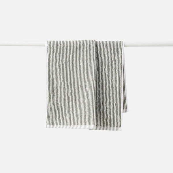 The Stripe Cotton Hand Towel is part of Città's Essentials collection, featuring timeless staples for everyday living. Soft and absorbent in pure, organic cotton with a simple olive and white stripe.