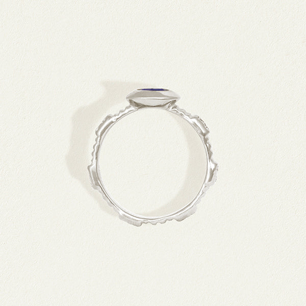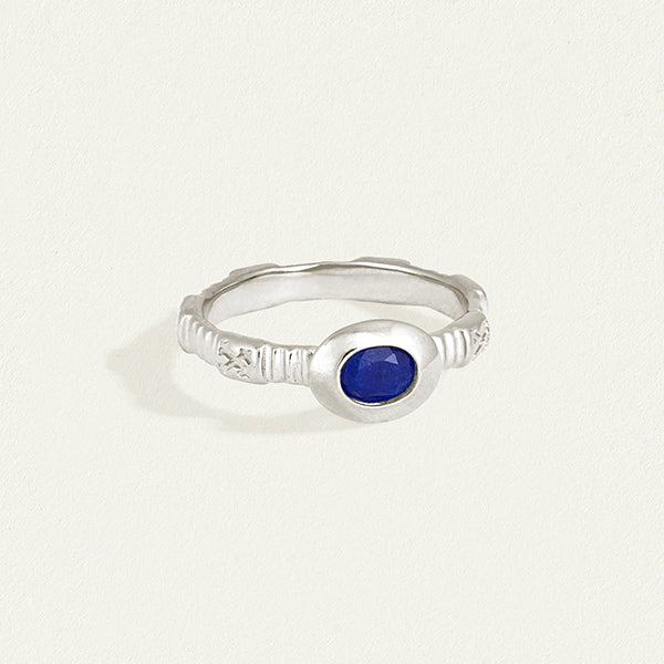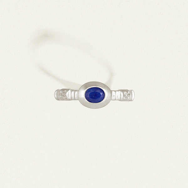 Crafted from recycled sterling silver, the Lazuli Ring is set within an oval bezel, the azure blue lapis lazuli is flecked with pyrite like stars in the night sky. The ridged band is etched with motifs inspired by ancient symbols, adding a point of difference to this solitaire dress ring.