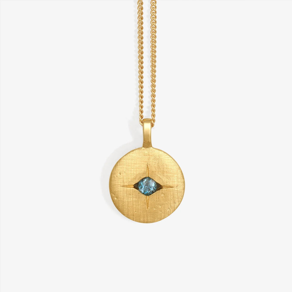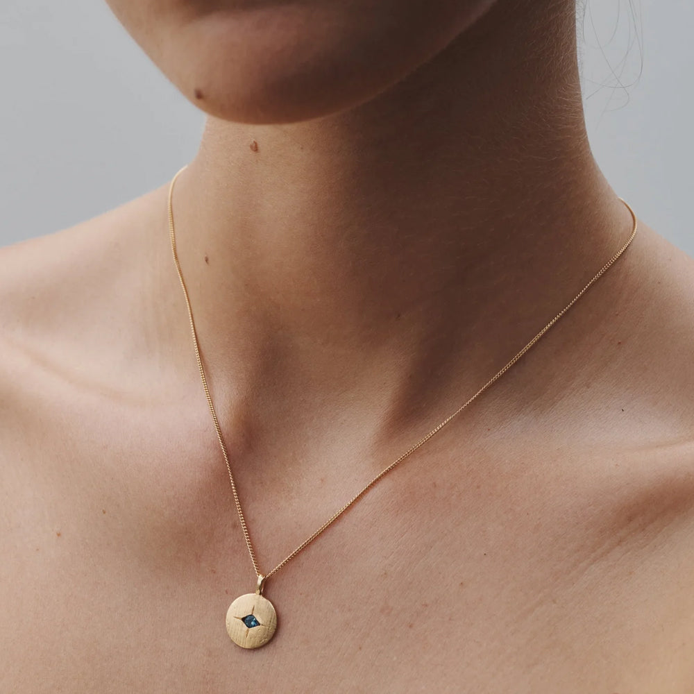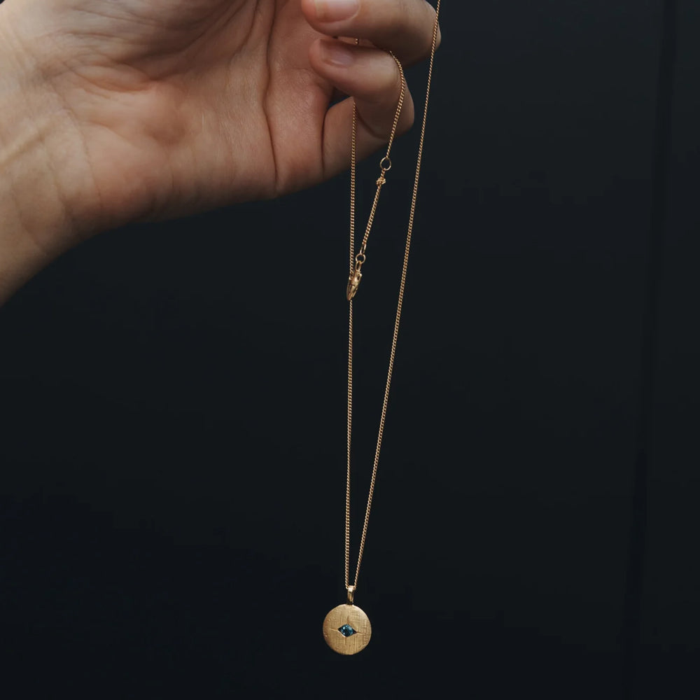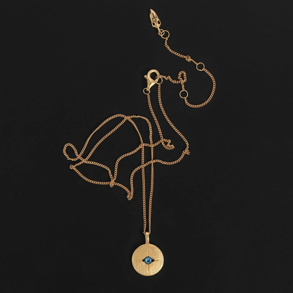 The Mavi Eye Necklace is crafted from 18k gold vermeil and features a cross-brushed pendant suspended from a single curb chain.