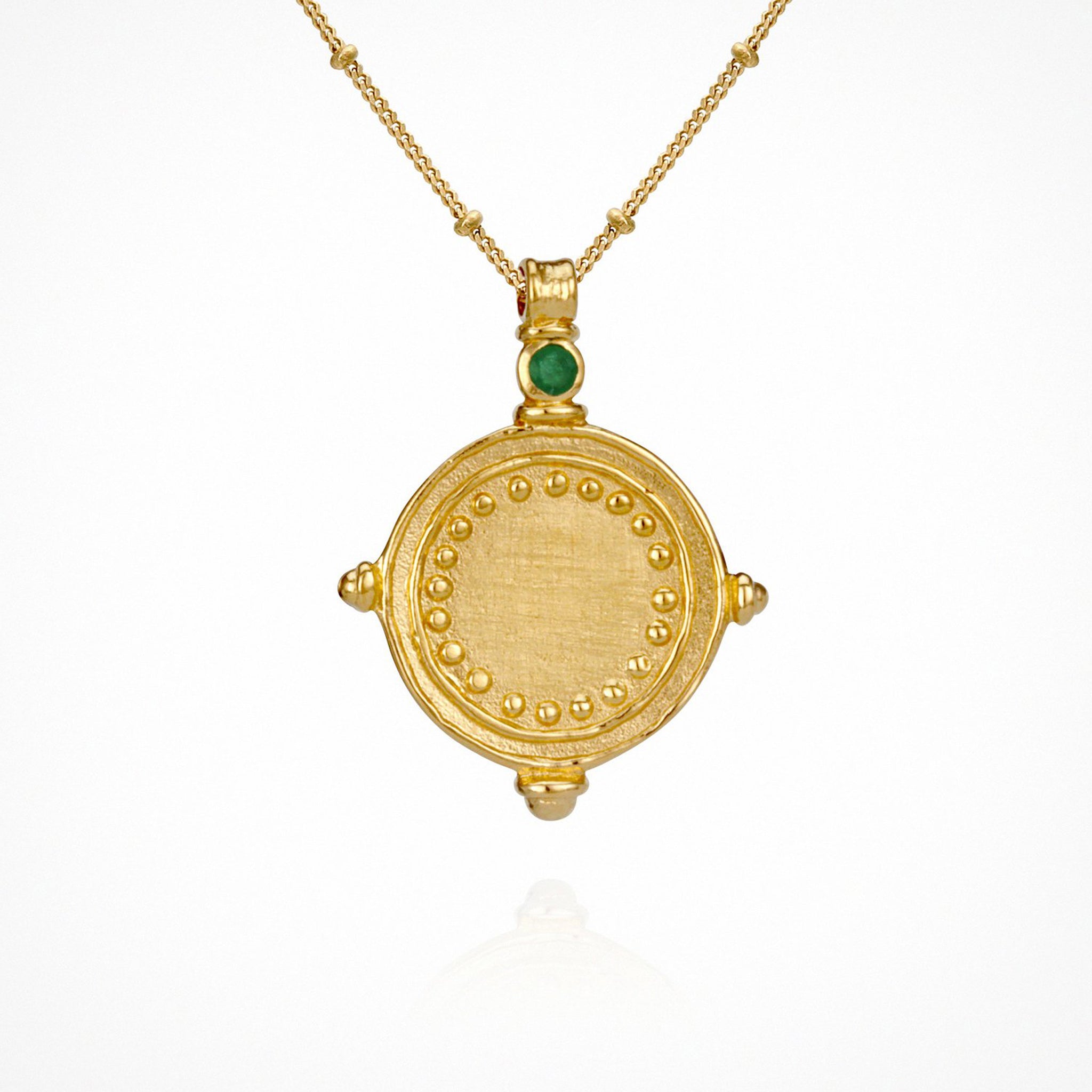 The Sura Necklace in cross-brushed gold is reminiscent of an ancient coin with its symmetric hand brushed embossed dotted detailing and circular shape, a faceted oval emerald at the tip of 4 symmetrical points completes the design on a fine chain with delicate gold bead detailing.