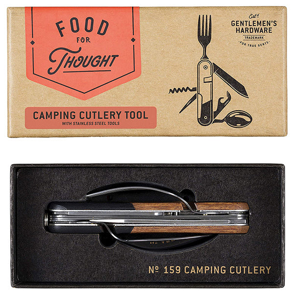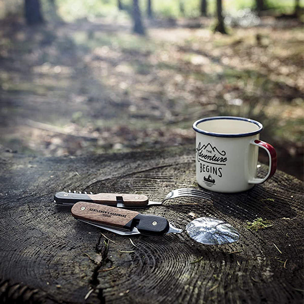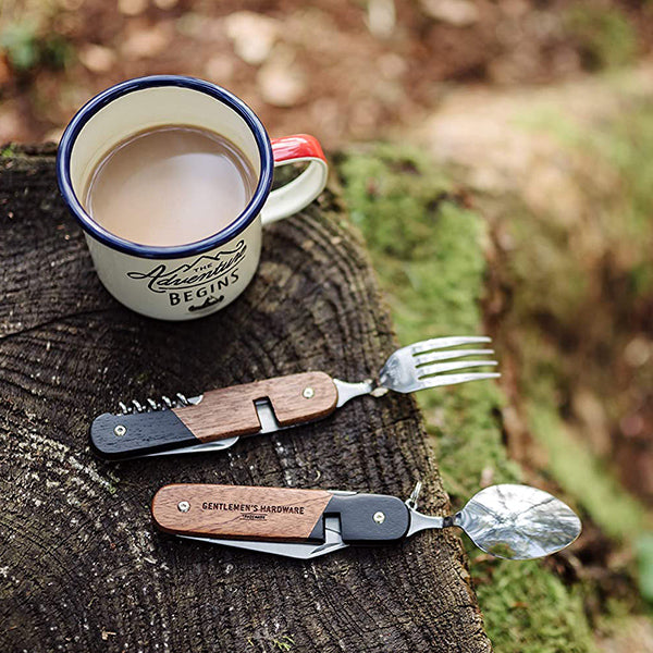 The only tool you'll probably ever need by the campfire! Gentlemen's Hardware presents the Camping Cutlery Tool, a multi-functional and exceptionally durable cutlery tool with a fork, knife, spoon, corkscrew, bottle and can opener, as well as a short blade. The handiest of compact camping accessories, each stainless steel utensil folds neatly into a smart wood handle, and the fork and spoon are detachable for mealtimes. The Camping Cutlery Tool comes in a Gentlemen's Hardware signature-style presentation box and makes the perfect gift for camping enthusiasts everywhere.