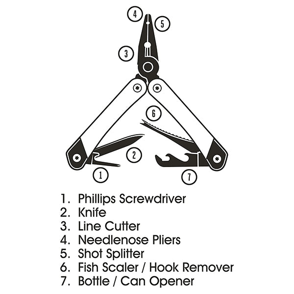 - Includes Needlenose Pliers, a Shot Splitter, Line Cutter, Knife, Fish Scaler and Hook Remover, Screwdriver and Bottle Opener
