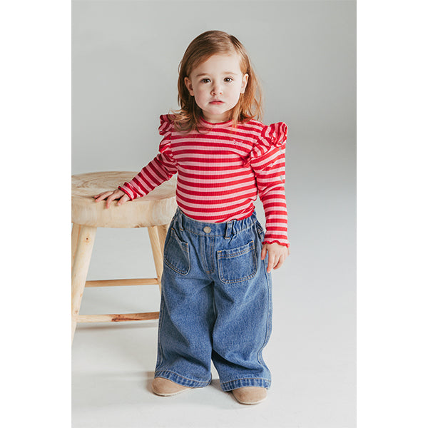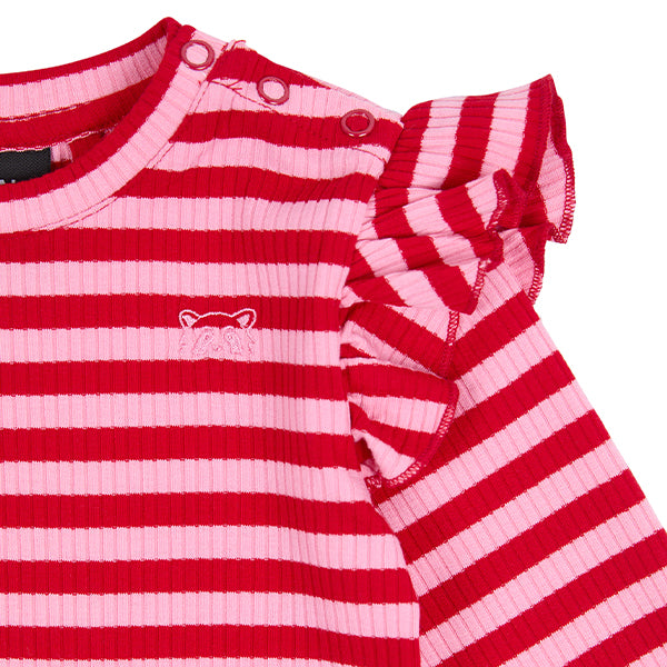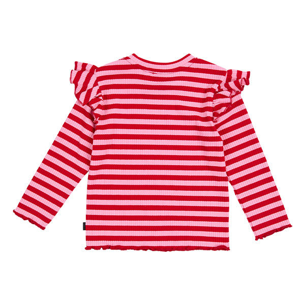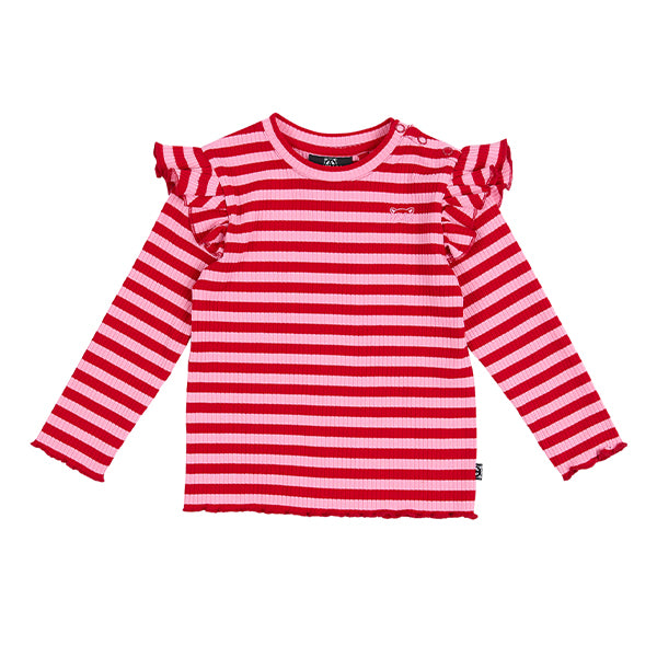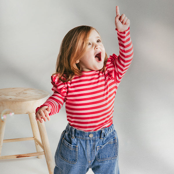 The Cue Long Sleeve Rib by Animal Crackers is a must have this season. The long sleeve top features a bold, fun striped rib with lettuce leaf trims on the hem and cuffs which gives both comfort and a point of different for the classic rib. The self fabric frills on the sleeves creature a cute feature and snap shoulder closures allows for easy, everyday wear.
