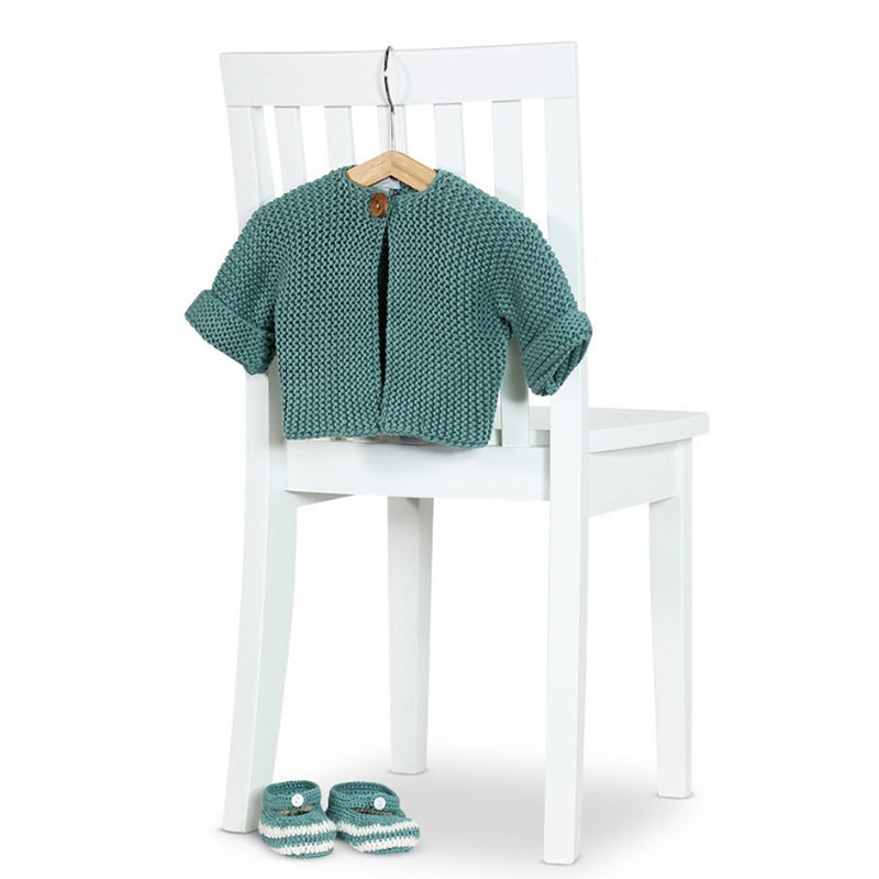 Keep bub warm and stylish with the Elf Cardigan. This beautifully crafted cardi is made from the softest cotton yarns, ensuring your little one stays cozy and comfortable. It features a charming garter stitch design, complemented by a single wooden button closure at the neck and turn-back sleeves.