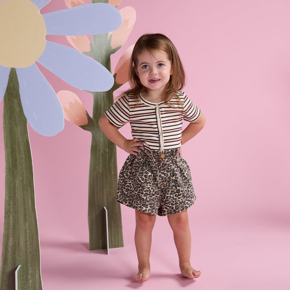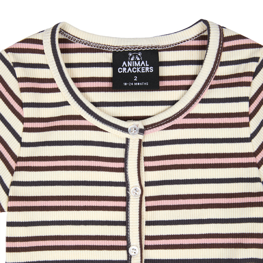 The Stripe Button Up Rib by Animal Crackers is made from a super comfortable cotton elastane rib. Featuring a stripe design, CF button-up closure, round neck and branded flag label. Team back with the Animal Shorts for the perfect summer outfit.