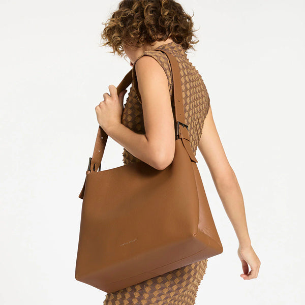 Built to handle almost any size impulse purchase, the Forget About It Bag has a magnet close top, an edgy angular silhouette and branded strap buckles.