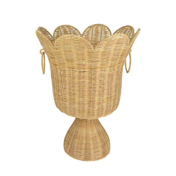 With a pedastal base and tulip-shaped body, the Pettine Rattan Tall Basket this an interesting styling piece. Carry handles make it practial to move around and add to its character.