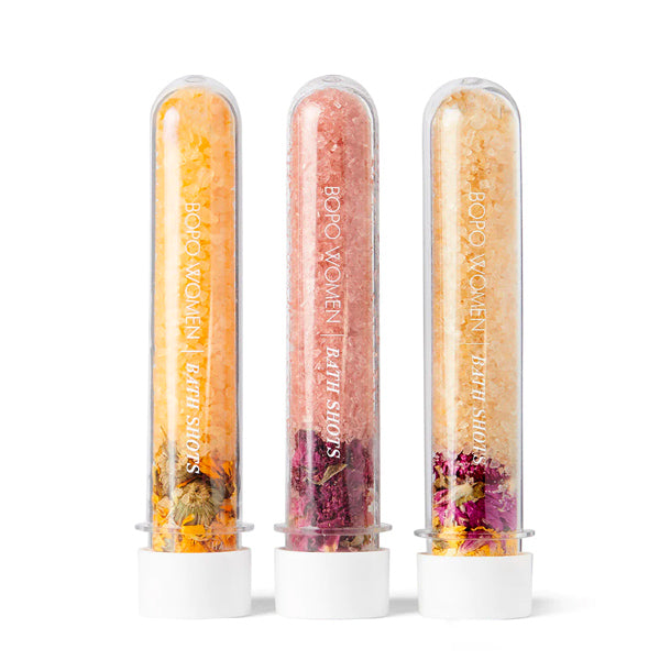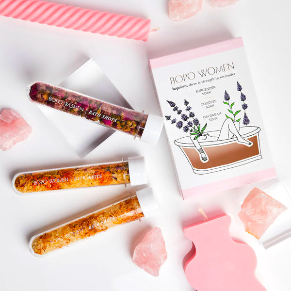A beautiful trio of Bopo Bath Shots. Each bath shot features a 100% pure blend of essential oils, mineral rich salts, fruit extracts, clays & organic flowers. Ingredients have been carefully selected to deeply nourish skin, whilst helping you to unwind and let go. Includes a Surrender Soak, Goddess Soak & Daydream Soak.