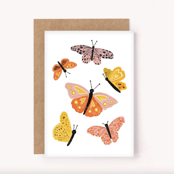 Colourful orange, pink and yellow illustrated butterflies make for the perfect everyday greeting card. Whether it's just to say hello to a friend or to send as a thank you note, this card is sure to bring some sunshine. Blank inside for your personal message.