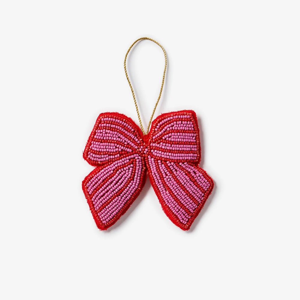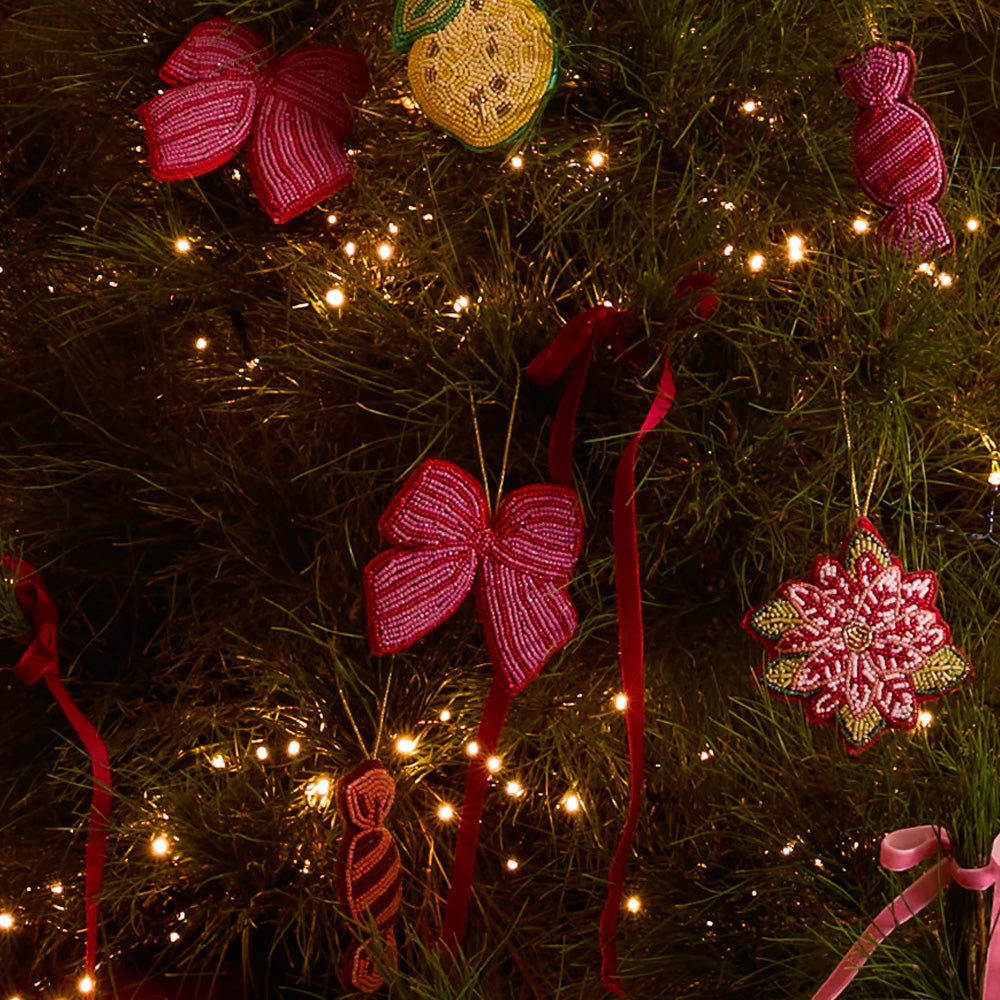 Symbolising the joy of giving, this hand-beaded Bow Decoration in vibrant pink and red adds a playful, festive touch to your Christmas tree.