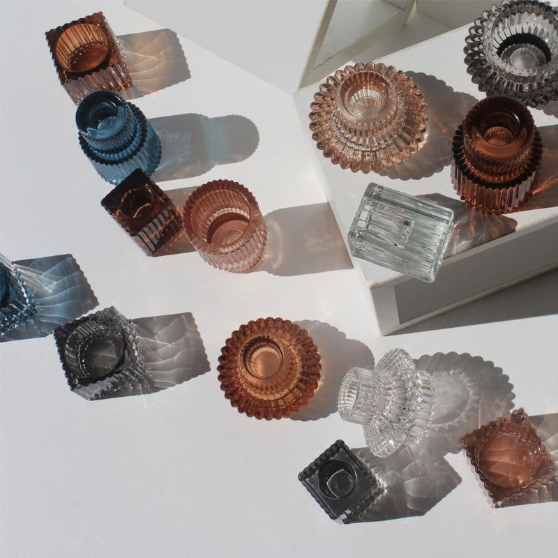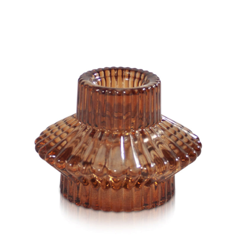 The Aida Vintage Glass Candle Holder in Amber has a striking, retro silhouette and elegant pleated glass finish. Cleverly designed to suit multiple candle types. Simply flip this duo candle holder over to hold tealight candles or use narrow side up for both Dinner and Taper candles.