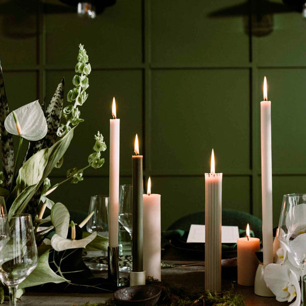 The hand poured unscented Olive Moreton Eco Dinner Candle has a diameter of 2 cm and a height of 30 cm and is made from vegetable stearin using natural dyes and a braided cotton, lead free wick. The result is a hard wearing candle with a clean, long lasting burn. Perfect on its own or combined with varied candle and glass combinations to create an eye catching centre piece or home decoration.