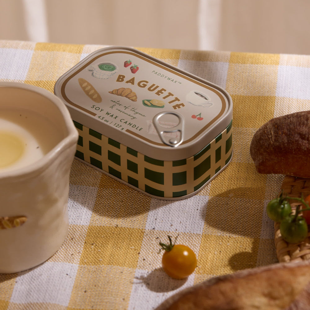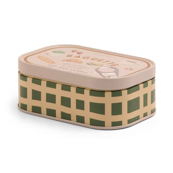In a collection inspired by French bistrosi, this Bistro Tin Candle emits a delicious aroma to match its charming Baguette design, with notes of thyme and rosemary.