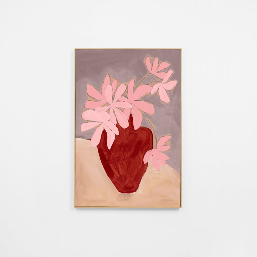 Add the finishing touch to your space with this pretty, hand-generated floral design. Featuring a bold pop of red in the vase, with pinks, peach and lilac featured in the flowers and background.