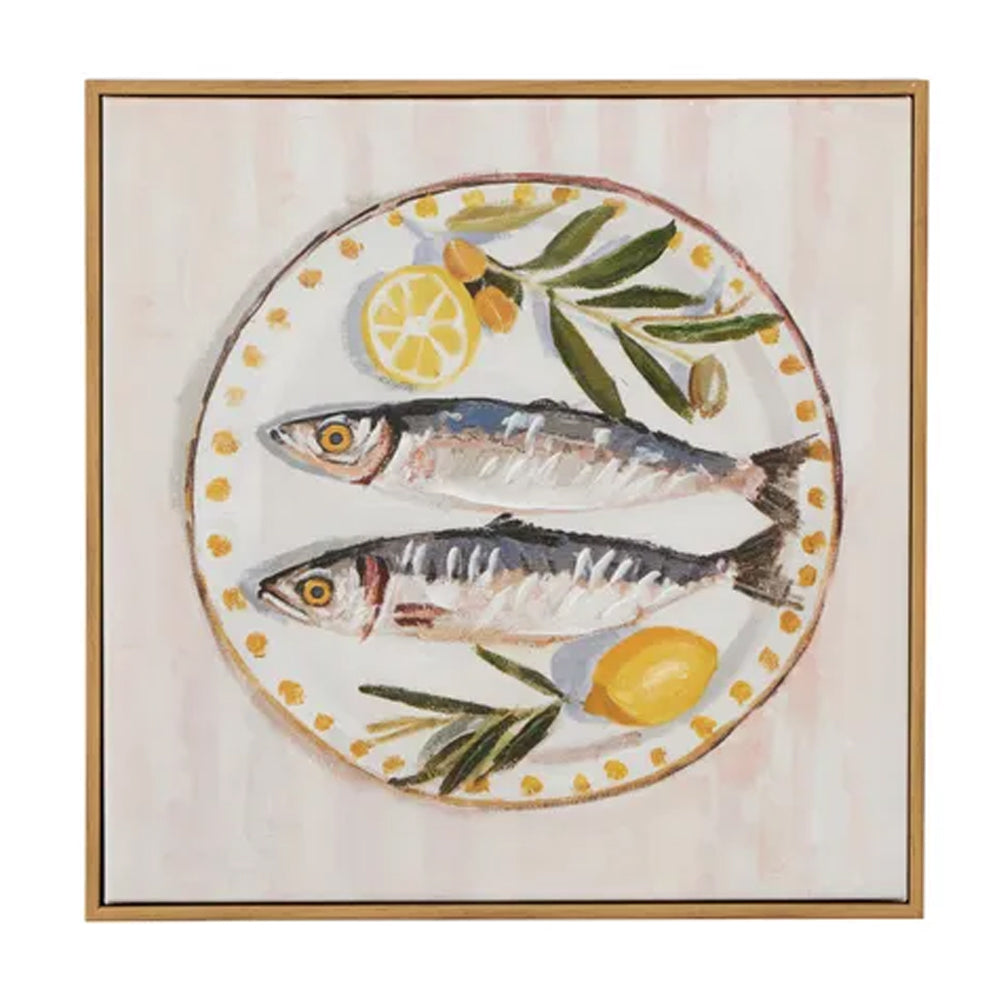 Capturing the warmth and flavour of Mediterranean dining, this still life print depicts two glistening sardines served with juicy lemon and sprigs of olive branches, on a spotted dinner plate.