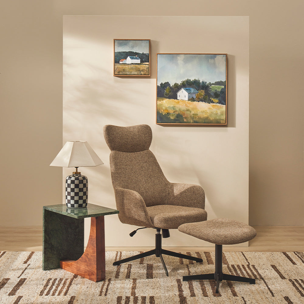 The calming Prairie House Canvas depicts a charming scene of a country home, nestled amongst the trees in rolling fields.
