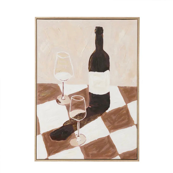 An abstract still life in this season's beloved browns, the Vino Canvas depicts a bottle and two wine glasses on a checkered table cloth. In an ash coloured frame, this piece is the pefect size to inject some pattern and personality into a smaller space.