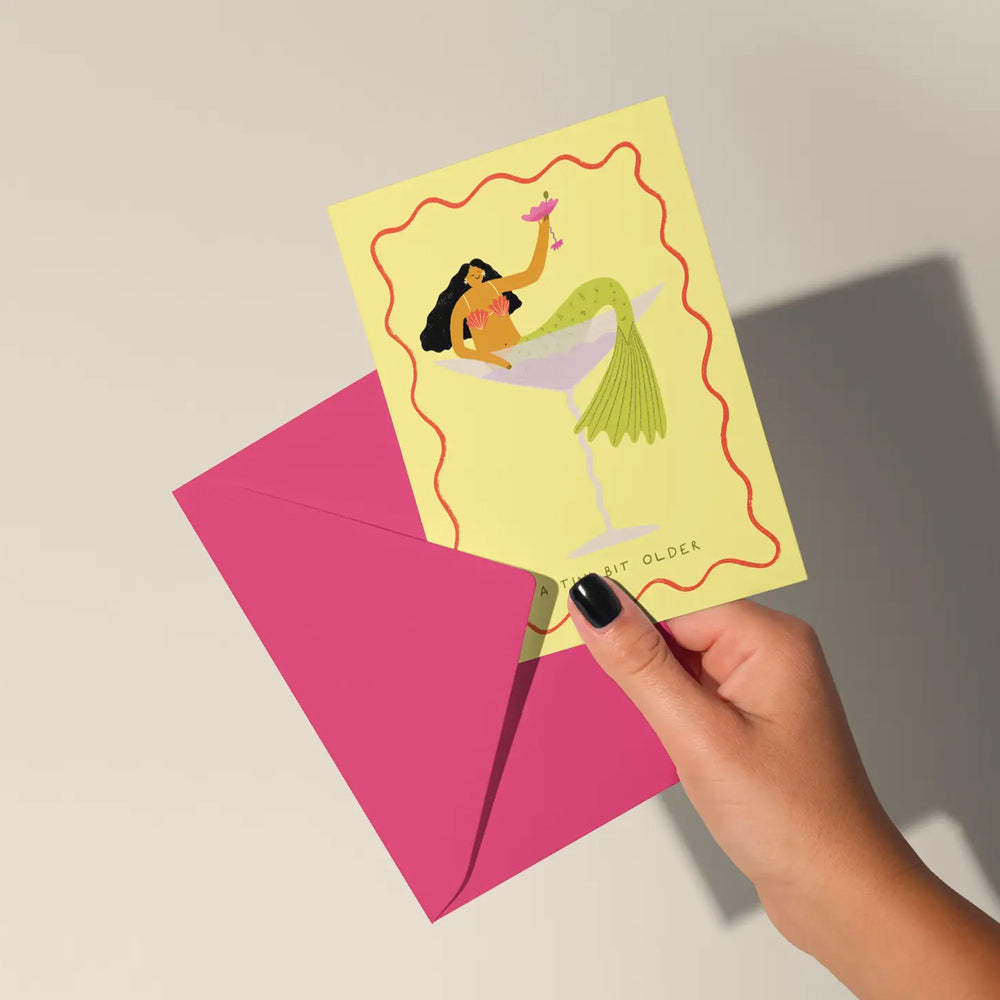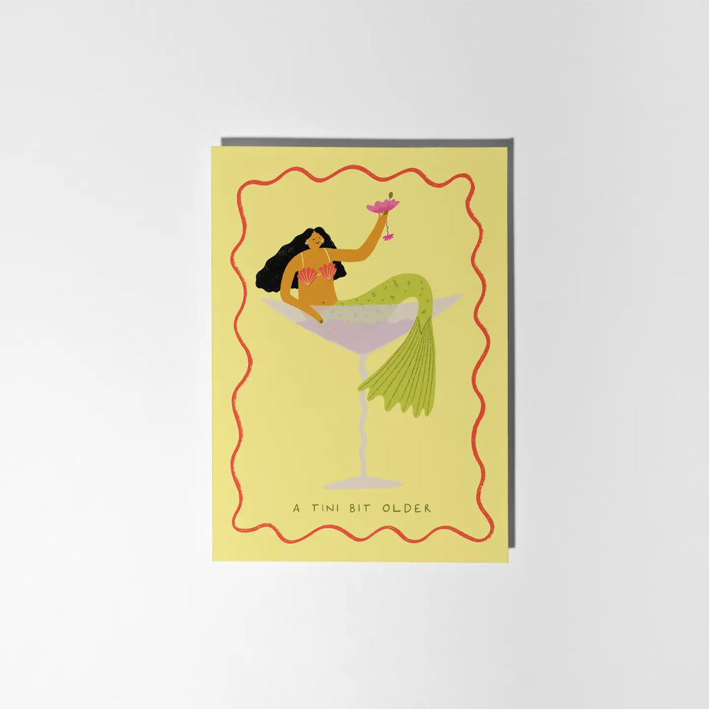 Contemporary birthday card featuring a trendy mermaid in a martini glass enjoying a drink. Surrounded by a squiggly red border with handwritten text reading 'A Tini Bit Older'.