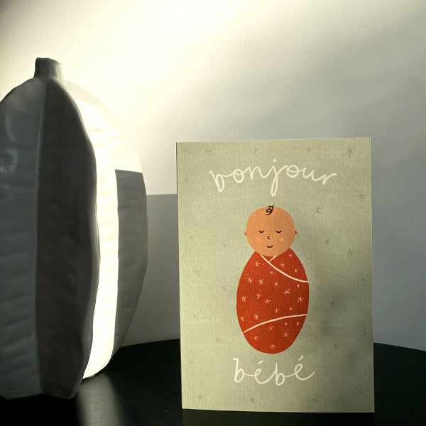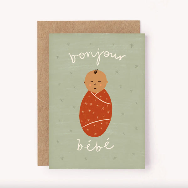 "Bonjour Bebe" (Hello Baby) greeting card, perfect for a baby shower or welcoming a new arrival. Created in a gender neutral colour palette, with a green background, rust coloured baby wrap and white hand-lettered message with tiny stars scattered. Blank inside for a personal message