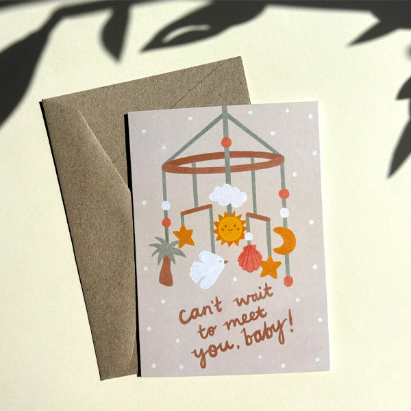 This Can't Wait To Meet You, Baby card is perfect for a baby shower or welcoming a new arrival. Created in a gender neutral colour palette, set on a beige background is a sweet baby hanging mobile with stars, moon, sun, shells, a palm tree and bird above the hand-lettered wording. Blank inside for your special message.