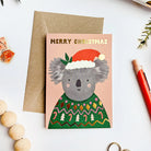 This sweet Christmas card stars an adorable koala in a green festive sweater, with a Santa hat adorned with a sprig of eucalyptus. A premium gold foil adds some holiday sparkle across the "Merry Christmas", Santa hat and sweater details. Blank inside for personal message.