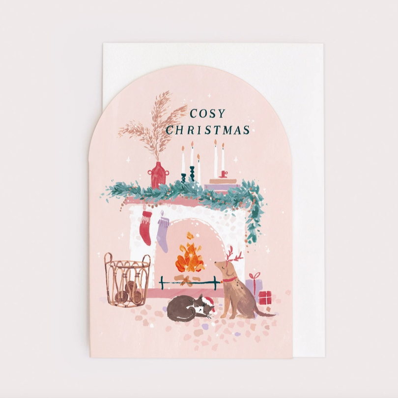 This holiday card reads "Cosy Christmas" and features a sweet illustration of sleeping cat and dog by a fireplace, with all the Christmas trimmings.