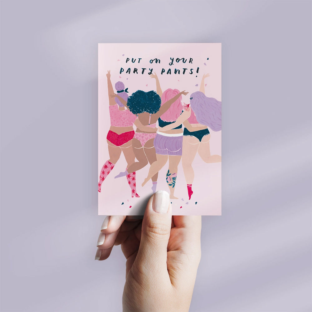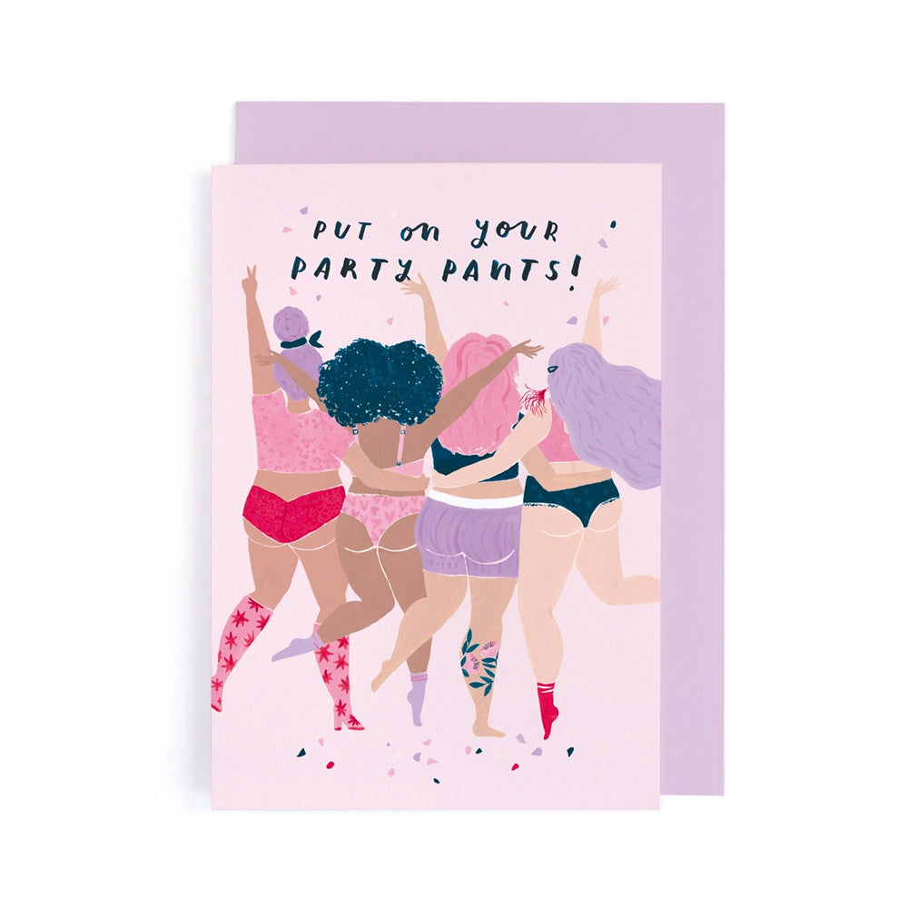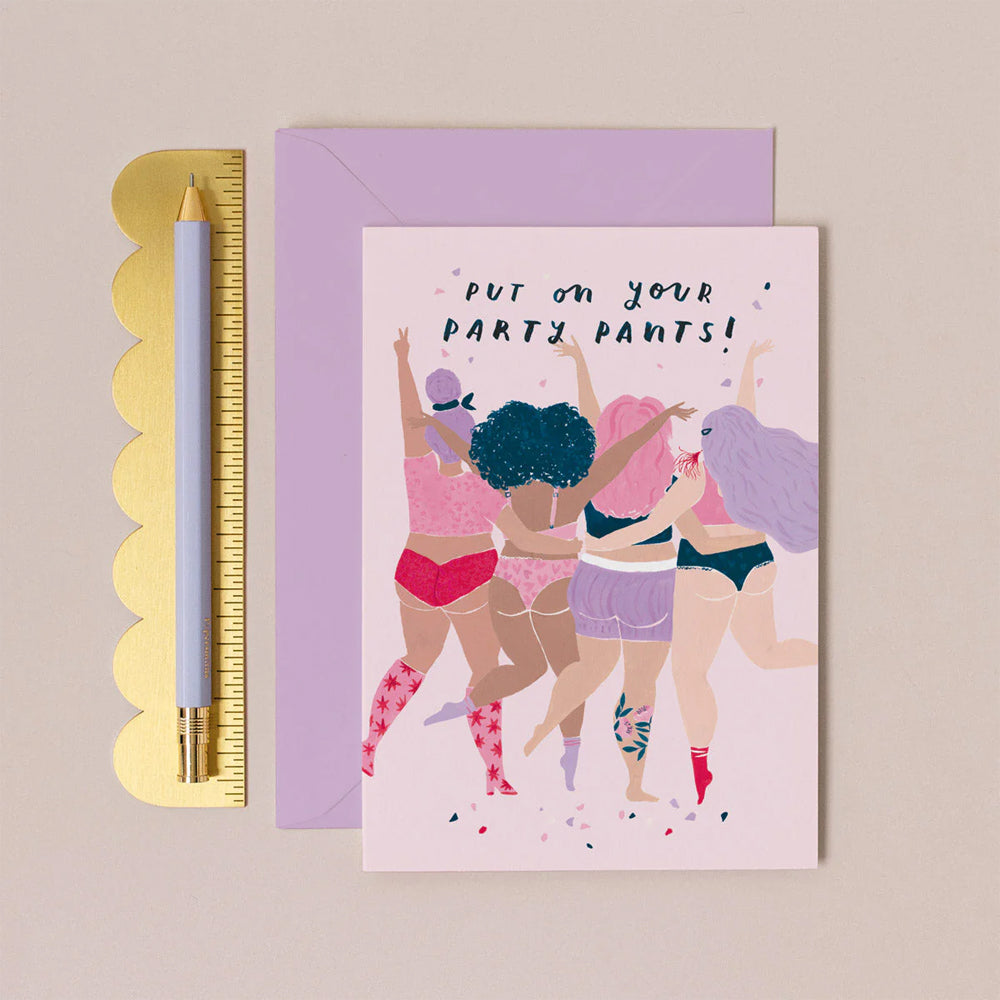 Time to "Put on your party pants"! A cheeky card to celebrate any occasion with your party pals.
