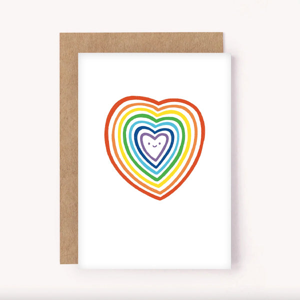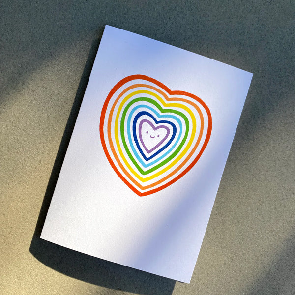 This colourful card is sure to bring joy. Featuring a sweet illustrated rainbow heart with smiling face, on a white background. It's simple design makes it perfect for so many occasions - Valentines Day, an anniversary, engagement, wedding, celebrating Pride, or simply sending a rainbow someone's way. Blank inside for a personal message.