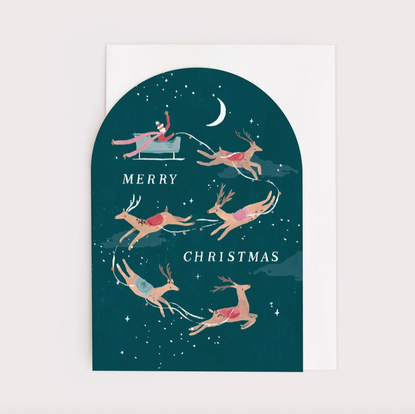 This modern arch shape card wishes a "Merry Christmas" and features Santa and reindeer dancing through the moonlit night sky.
