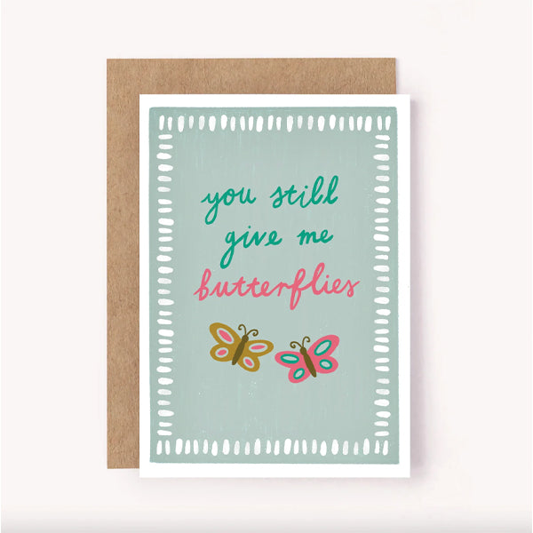 Let someone special know they still give you butterflies with this illustrated greeting card. Perfect for anniversaries, Valentine's Day, or just because, this card doubles as a special keepsake. Featuring two butterflies below the handwritten message, "You still give me butterflies," bordered by a playful lined frame on a soft background. Blank inside for a personal message.