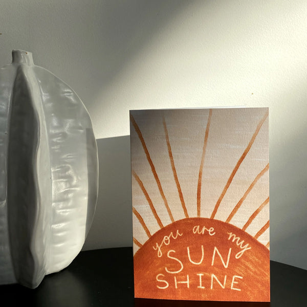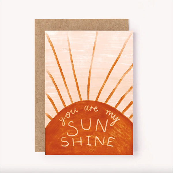 Illustrated "You are my sunshine" greeting card, with a painted sunshine and hand-lettered design on a pinky beige background. Perfect for an anniversary, loved one or simply brightening someone's day. Blank inside for a personal message