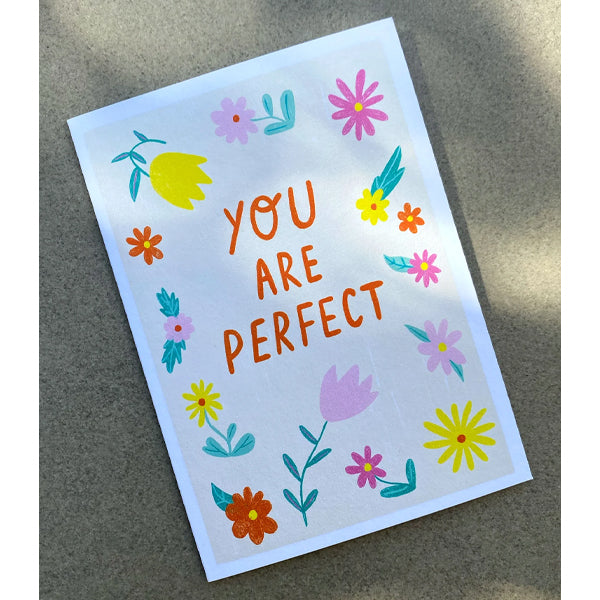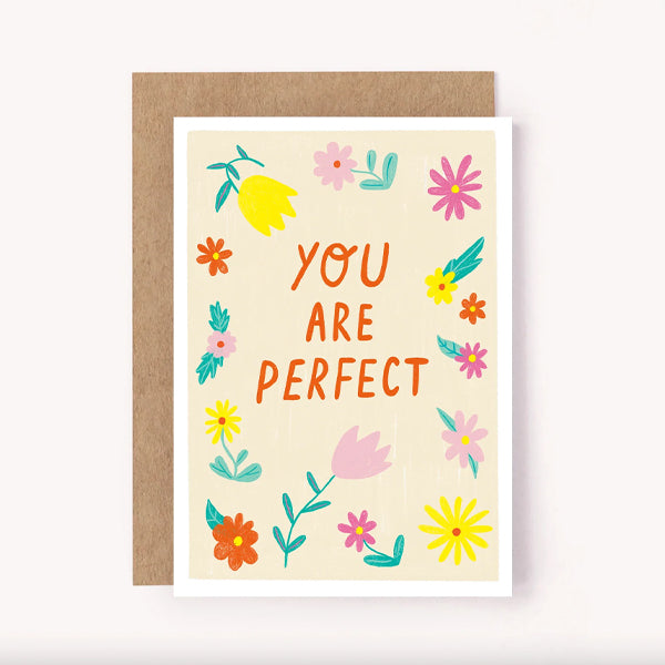 Hand-lettered "You Are Perfect" greeting card with colourful flowers set upon a beige background. This card is the perfect way to brighten someone's day. Blank inside for a personal message.