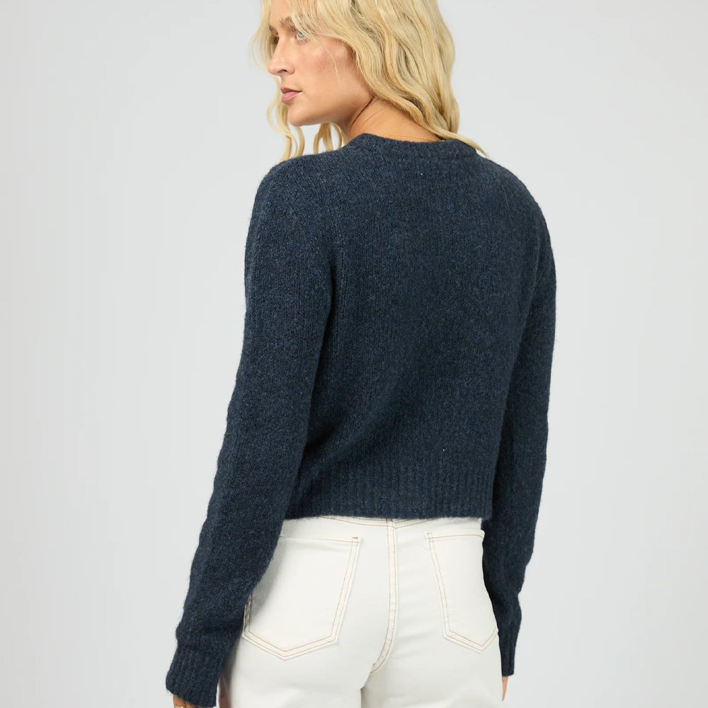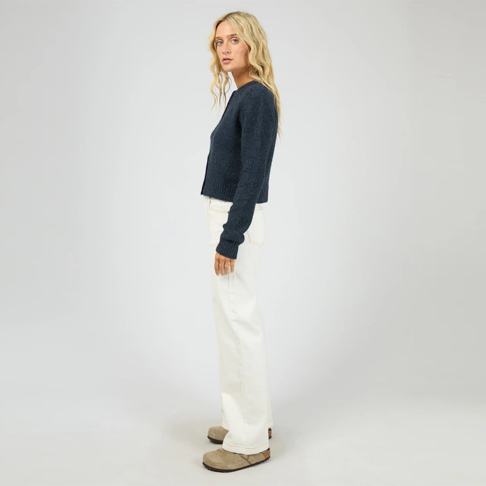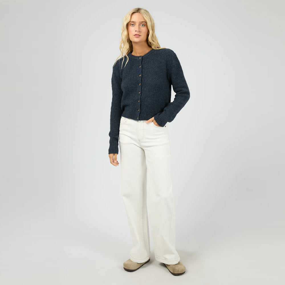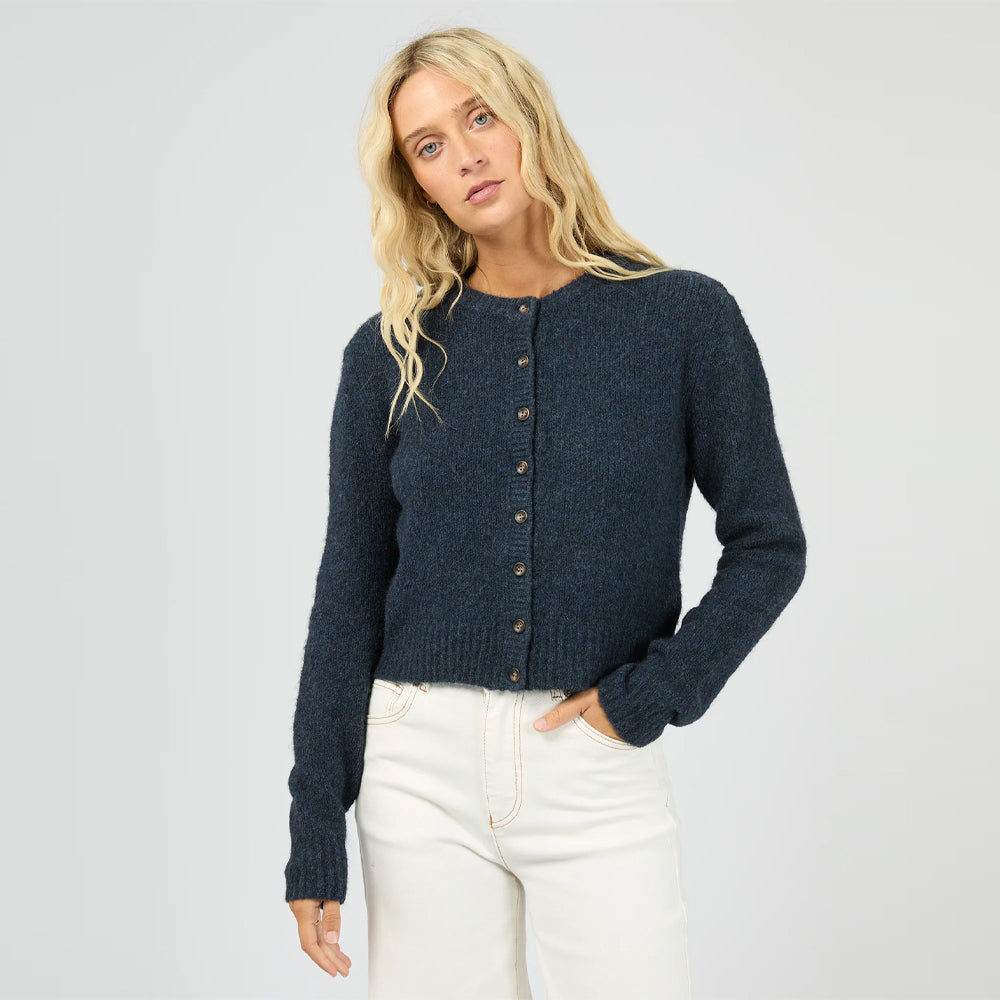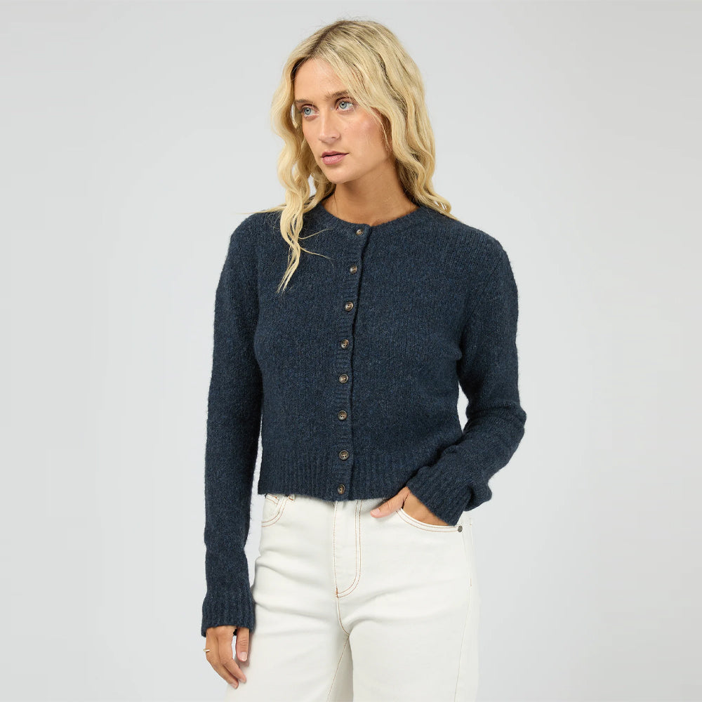 Classic and essential - the Bayside Cardigan (All About Eve Clothing) in Ink is a timeless knit designed for effortless everyday wear. Cut in a regular fit, it offers a neat silhouette that sits comfortably through the body without feeling restrictive. Crafted from recycled polyester, it provides warmth while remaining lightweight. Buttons down the front allow for versatile styling, whether worn closed as a top or layered open over tees and dresses. This cardigan is an easy choice for work, weekends, and relaxed layering.