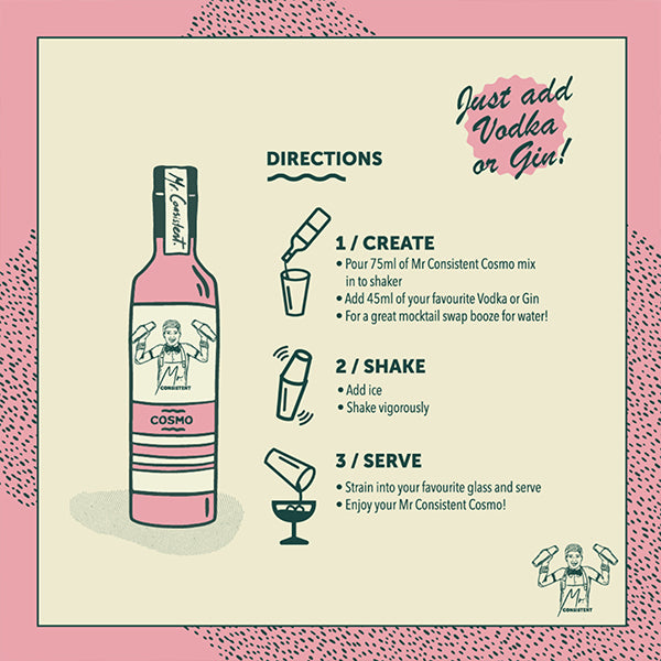 Don't forget, all of my mixers already come booze-free and can be served as a mocktail! Simply add 45ml of water to your Mr. Consistent cocktail for the booze-free option!