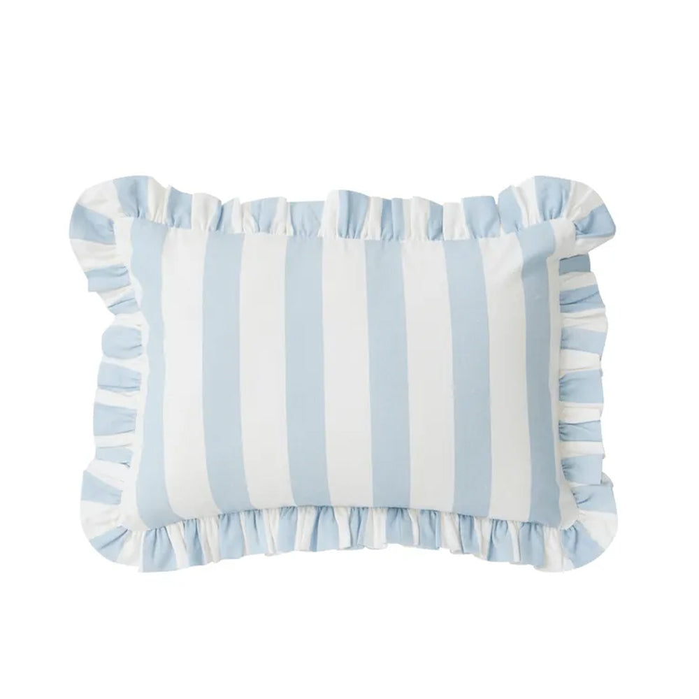 With a bold stripe design in a soft sky blue, and a large ruffled edge, the Bonny Cotton Cushion is a playful statement. Layer it with a block colour cushion, or lean in with clashing patterns for a fun look.