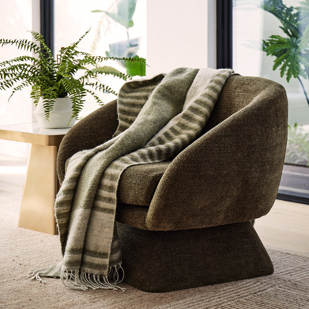 The Forest Throw by Grand Designs is crafted from a soft touch acrylic and wool blend in a soft browny-green.