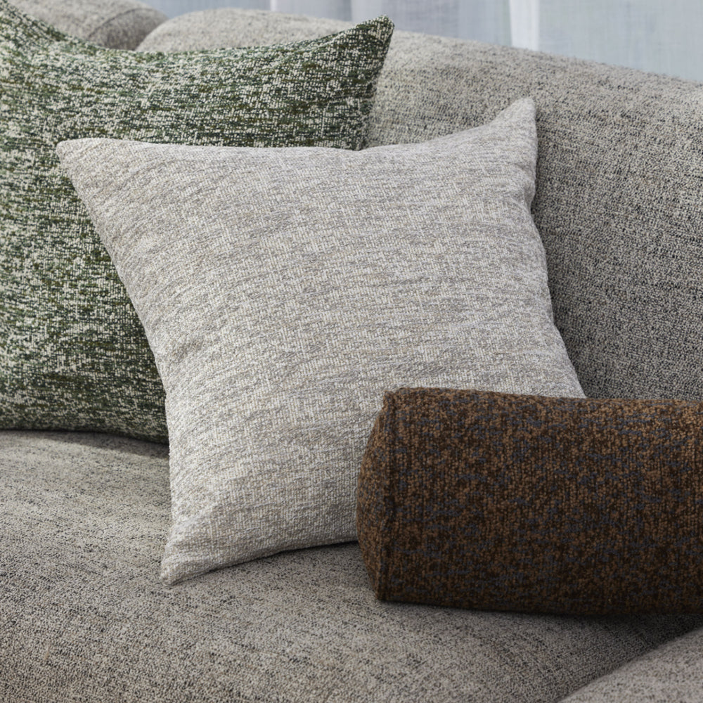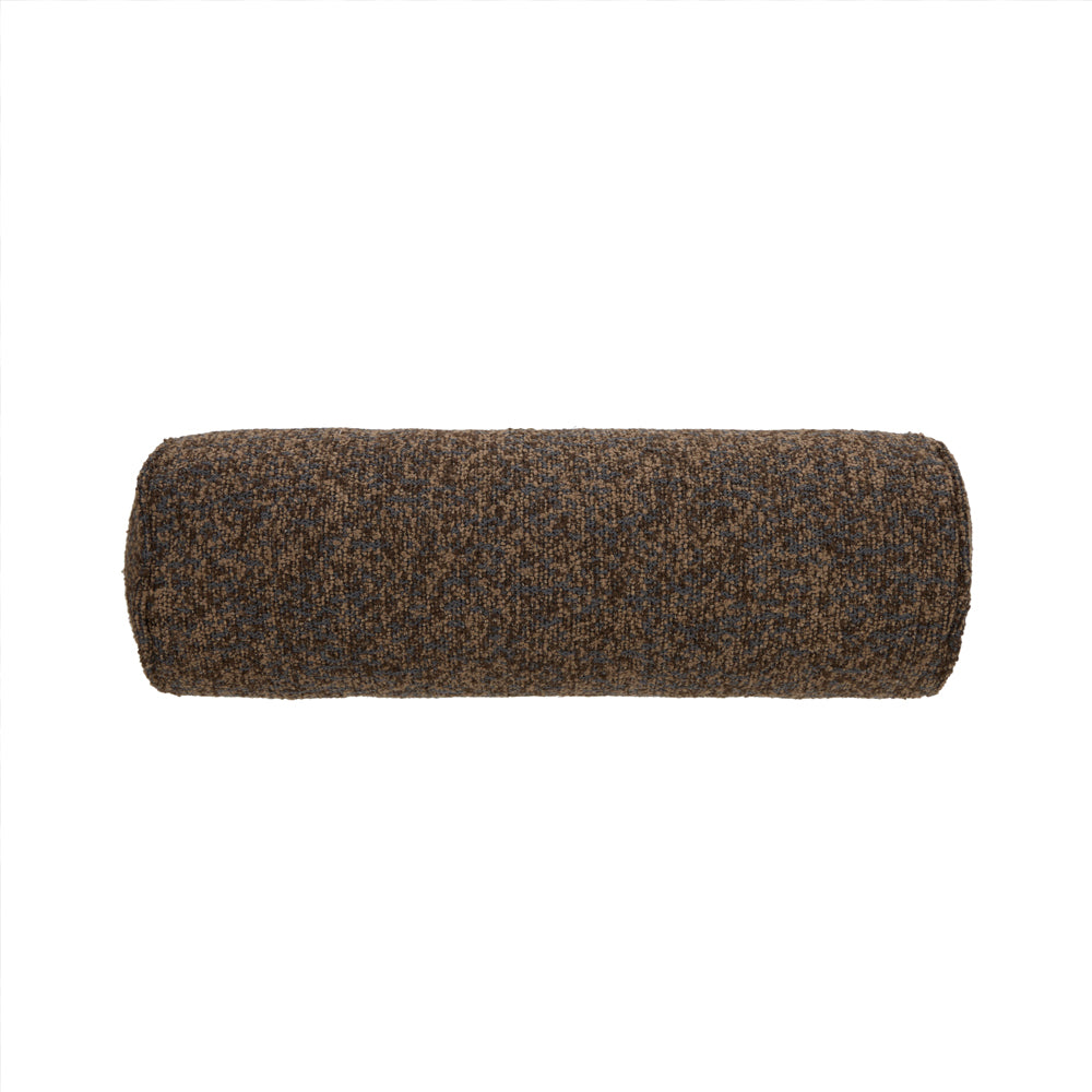 The Koba Boucle Bolster Cushion features a textured boucle cover in a rich dark brown, with flecks of lighter brown and navy.