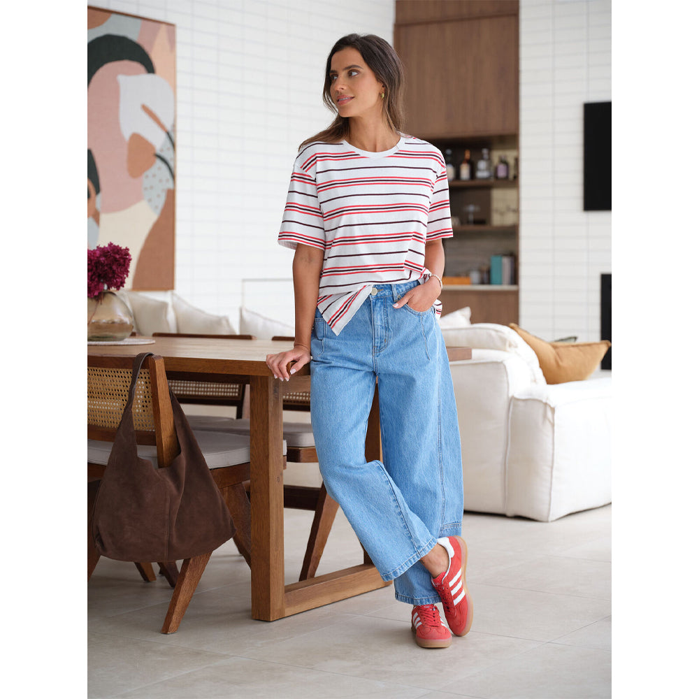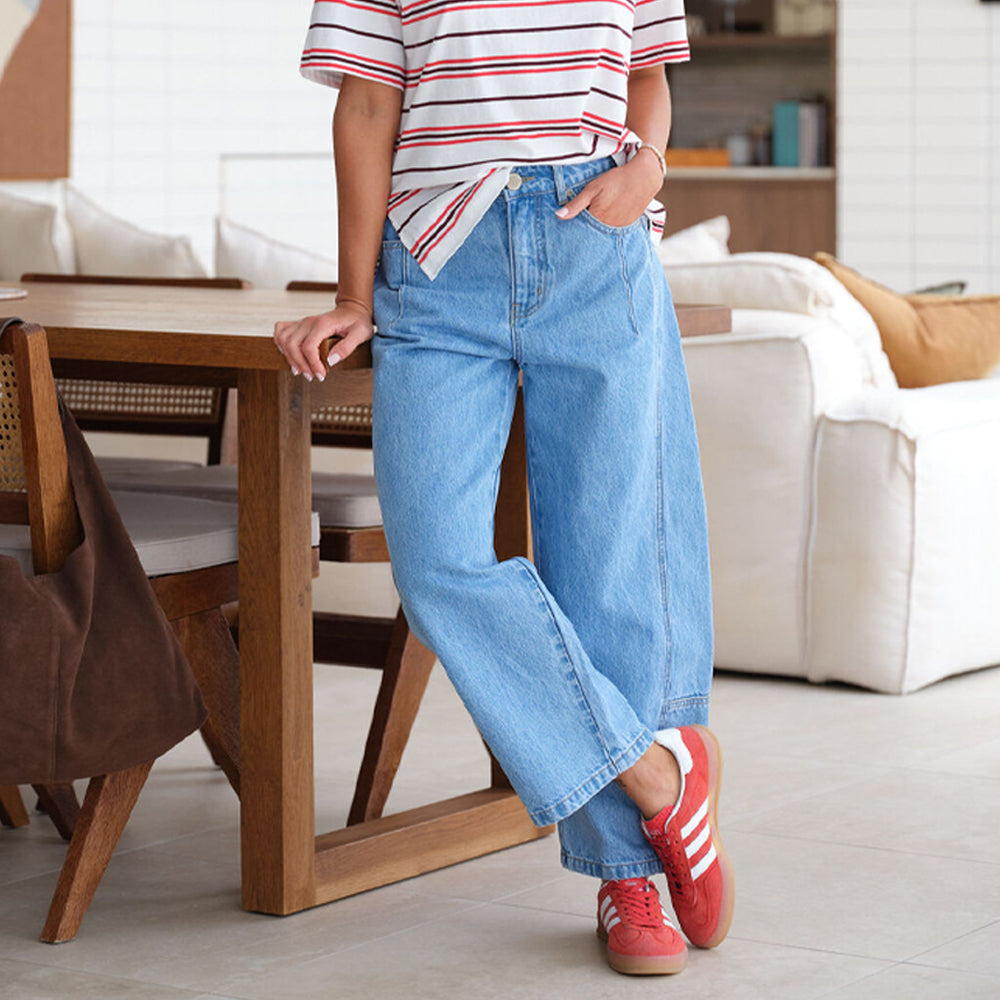 Introducing the Darted Tapered Barrel Jean, made from heavy rigid denim with 21% recycled cotton. With a mid-rise fit and a tapered barrel leg that hits just above the ankle, these jeans offer a slightly cropped, flattering silhouette. The dart detailing on the front pockets and side panel seam add a touch of subtle style. Your new go-to for effortless, everyday cool.