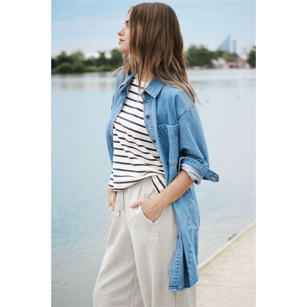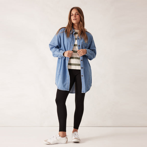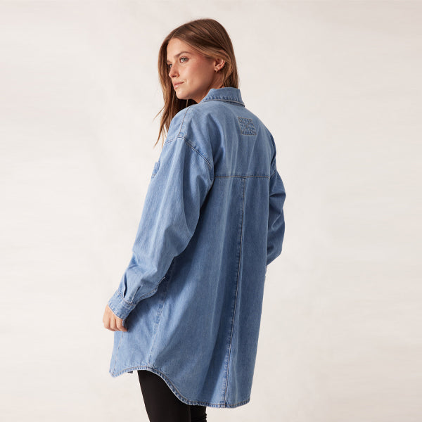 Introducing the Maeve Longline Panelled Denim Shirt - crafted from soft, 8.6oz lightweight denim, this shirt exudes effortless cool. With a little extra length and a little extra slouch, this style is sure to add an edge to your high rotation pieces. These details paired back with a classic shirt collar and sleeve, provide the perfect shirt for everyday wear.