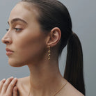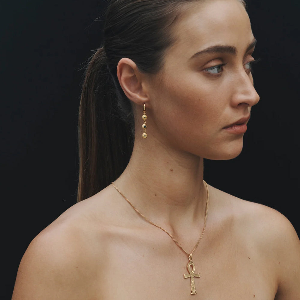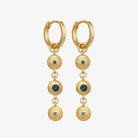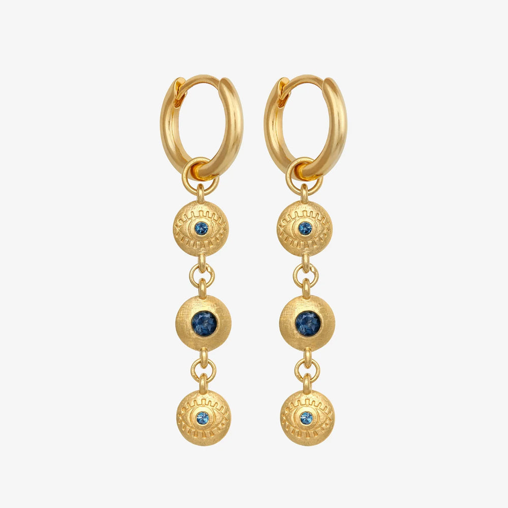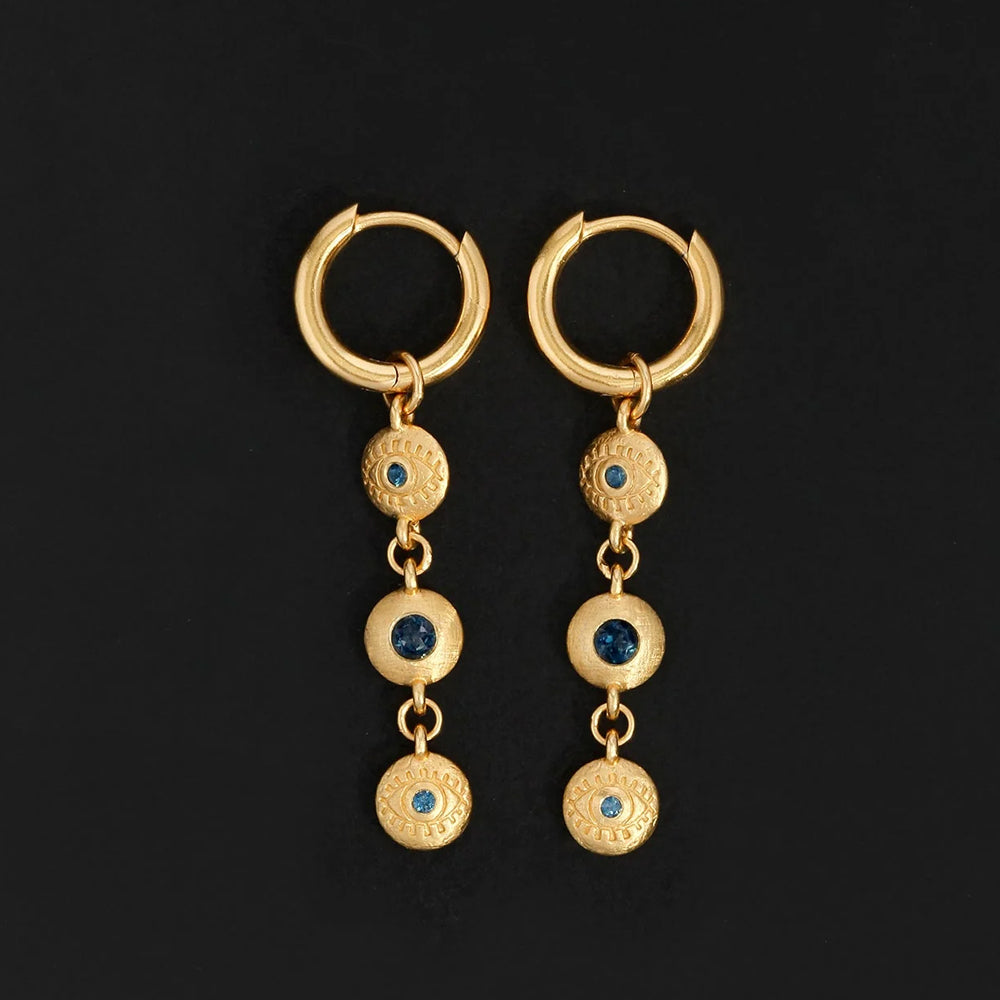 The Blessing Earrings feature a series of cross-brushed, lentil-shaped discs suspended from polished huggie hoops. The mati - or evil eye - motif is carved into the top and bottom discs, a subtle symbol of protection.