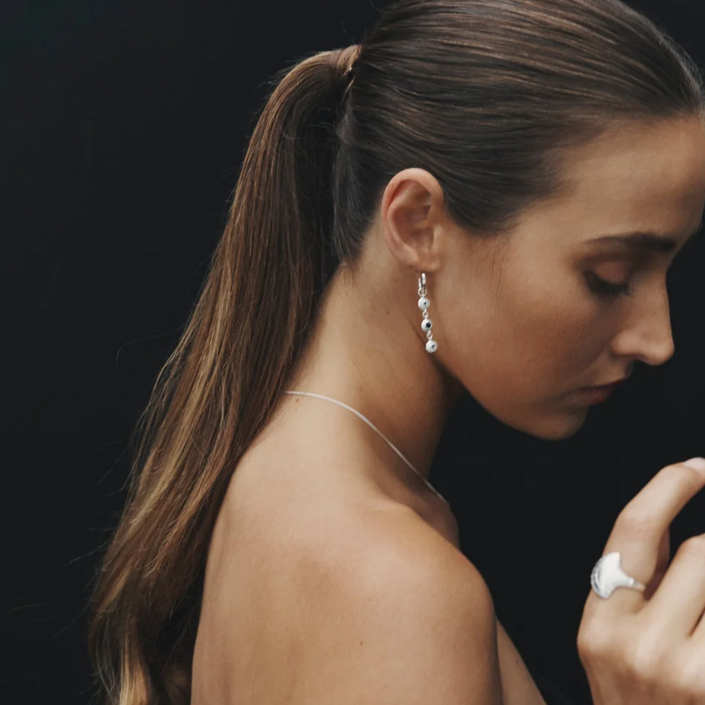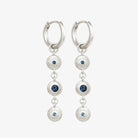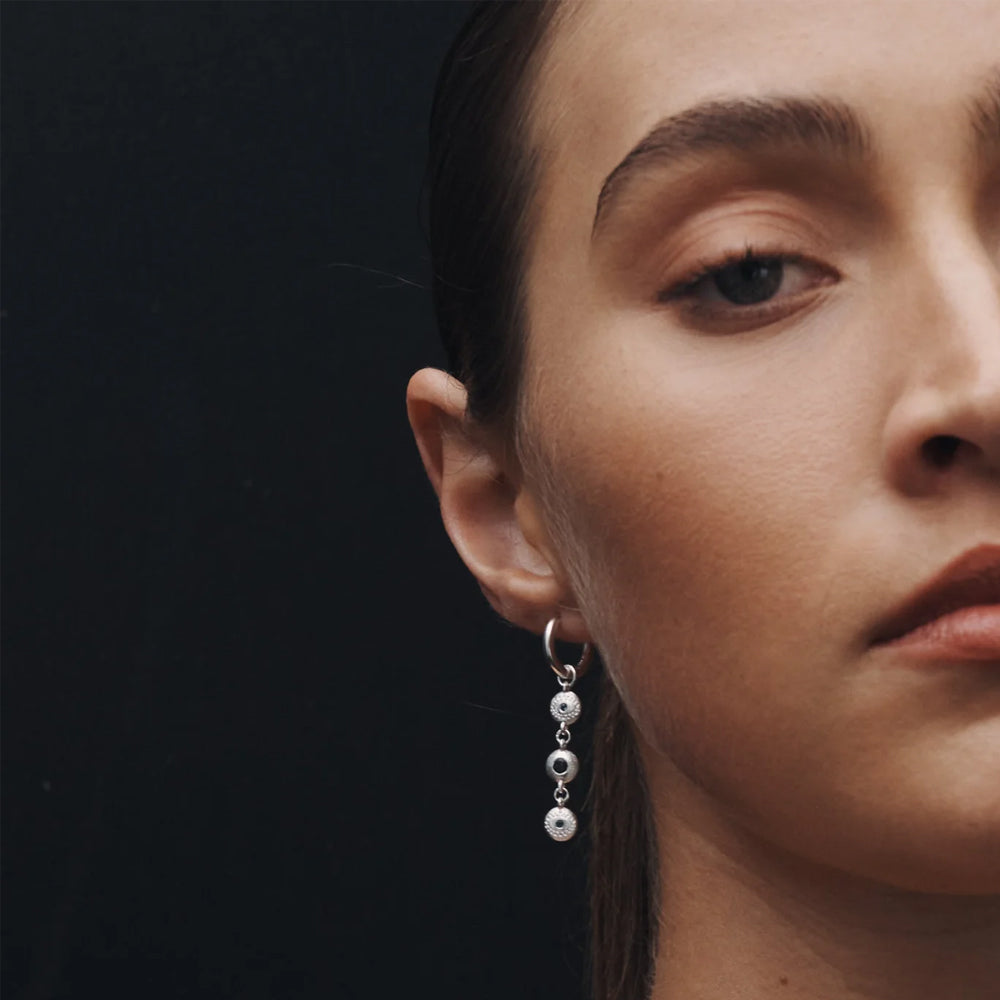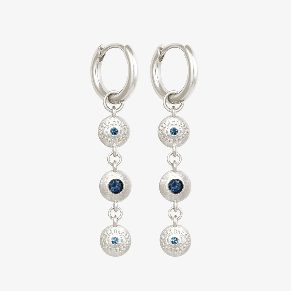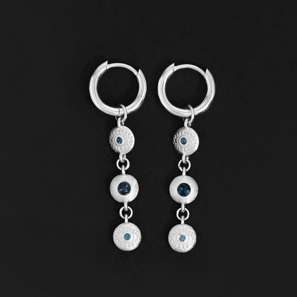The Blessing Earrings feature a series of cross-brushed, lentil-shaped discs suspended from polished huggie hoops. The mati - or evil eye - motif is carved into the top and bottom discs, a subtle symbol of protection.
