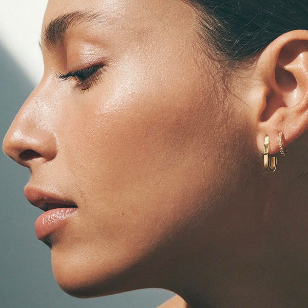 The Chloe Peridot Huggies in 18K Gold Vermeil are a contemporary interpretation of the classic hoop earring. The name Chloe stems from Ancient Greek roots, meaning ‘young, green shoot’. The closed circle design is symbolic of the cyclic movement of the seasons and is elevated by a channel of princess-cut peridot. These verdant gemstones evoke a sense of freshness and possibility.