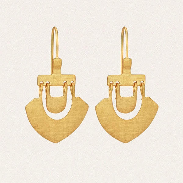 Three pieces of 18k Gold Vermeil are moulded together to make the shimmering Lilu Earring. The lustre of this cross brushed earring shimmers in the sunlight with a light swing. These fluent formed shapes are reminiscent of times gone by.