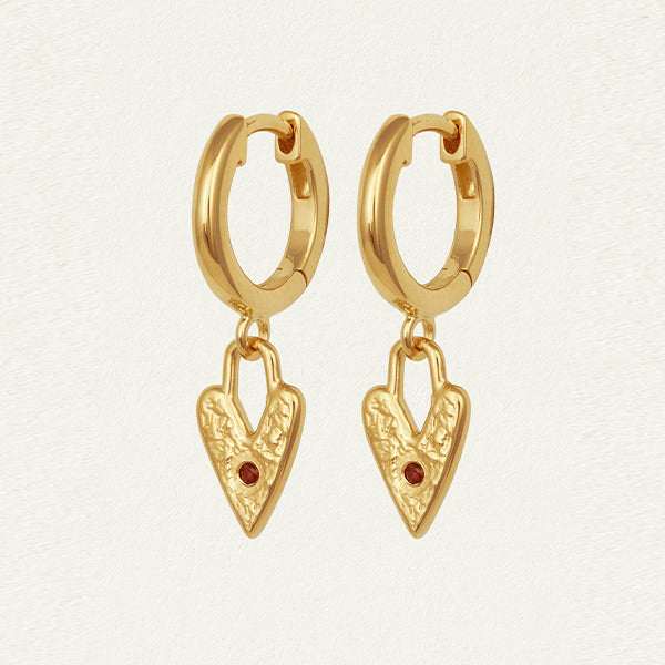 These sweet drop earrings feature a huggie closure and heart-shaped pendants adorned with garnets. Representing passion, these fiery gemstones add warmth to these heart earrings.