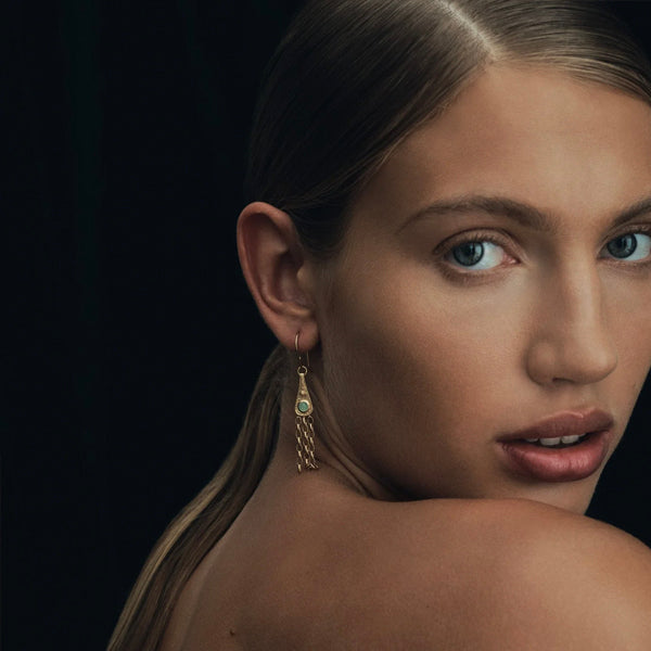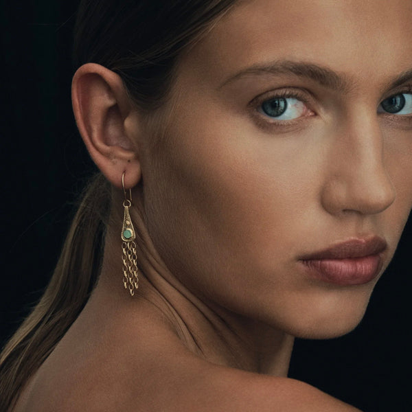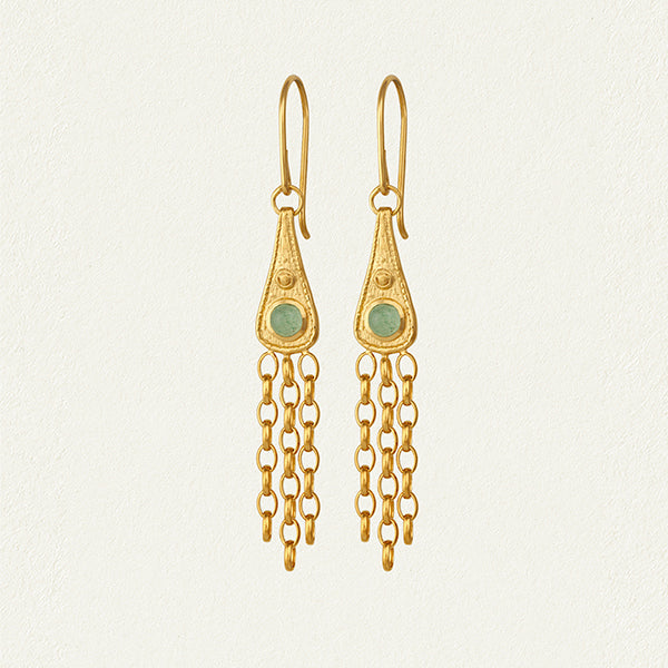 The 18k gold vermeil Talis Earrings are a chandelier style, set with green aventurine cabochons, a stone historically linked to good luck and prosperity.