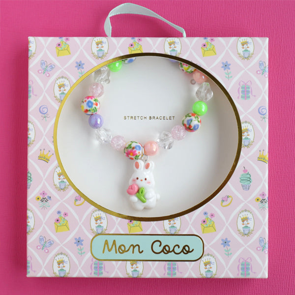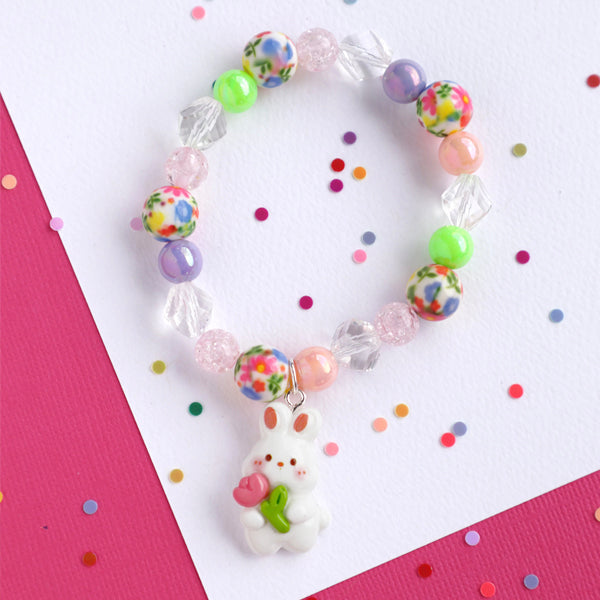 The Tulip Bunny Bracelet is bursting with colour and interest. This elastic bracelet is made from a mixture of beads of differing designs and textures, including several with a wonderfully intricate floral pattern. But the main feature is the adorable white bunny charm holding a single blushing pink tulip. Such a cutie!
