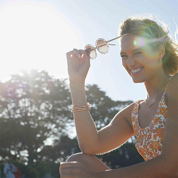This signature style is constructed with rose gold hinge bands and adjustable silicone nose pads for the ultimate bridge fit and light weight comfort.