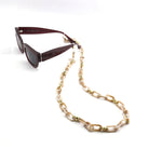 A must-have accessory for your sunnies, this stylish Latte Glasses Chain is fitted with claw clasp hardware and clear silicone rubber connectors to keep your sunglasses handy at all times. It features oval shaped links with a marble-like effect, broken up by gold details.